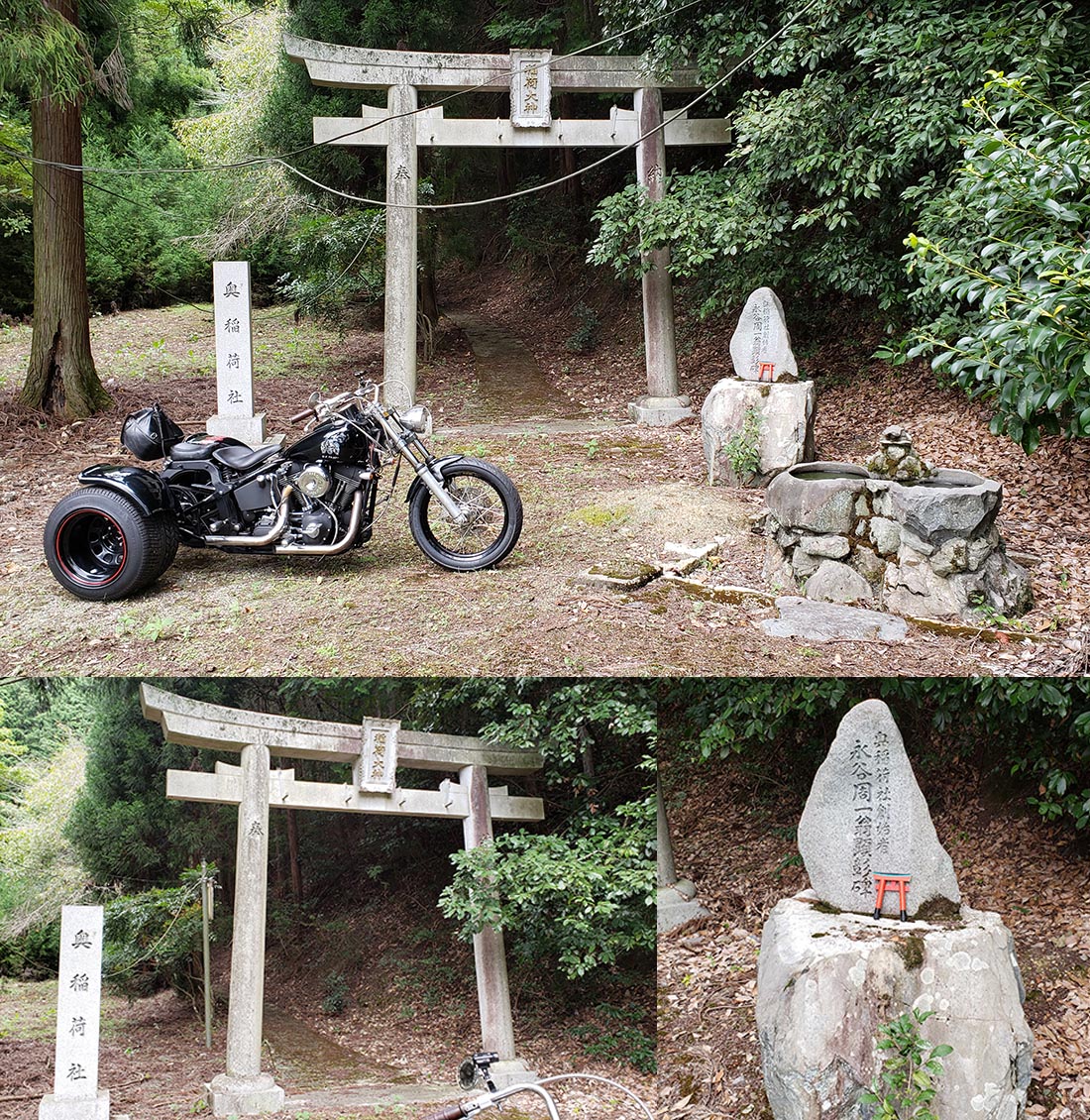 それから行に見つけた寂れた神社に寄ってみました。 ここは、奥稲荷社知らずに通ってしまいそうな隠れたさびれた神社です。 ここにも、石碑にお賽銭置いて無事に帰れるように拝んで出発しました。帰ってネットで調べたら、奥にある神社は、 今では、廃神社のように荒れている状態でした。何か寂しい気持ちになりました。 その後宇治橋を通って帰ってきましたが、家につく2Km手前ぐらいから小雨が降ってきました。問題無かったです。 今日のプチツーは、トータルで50Kmぐらいでした。